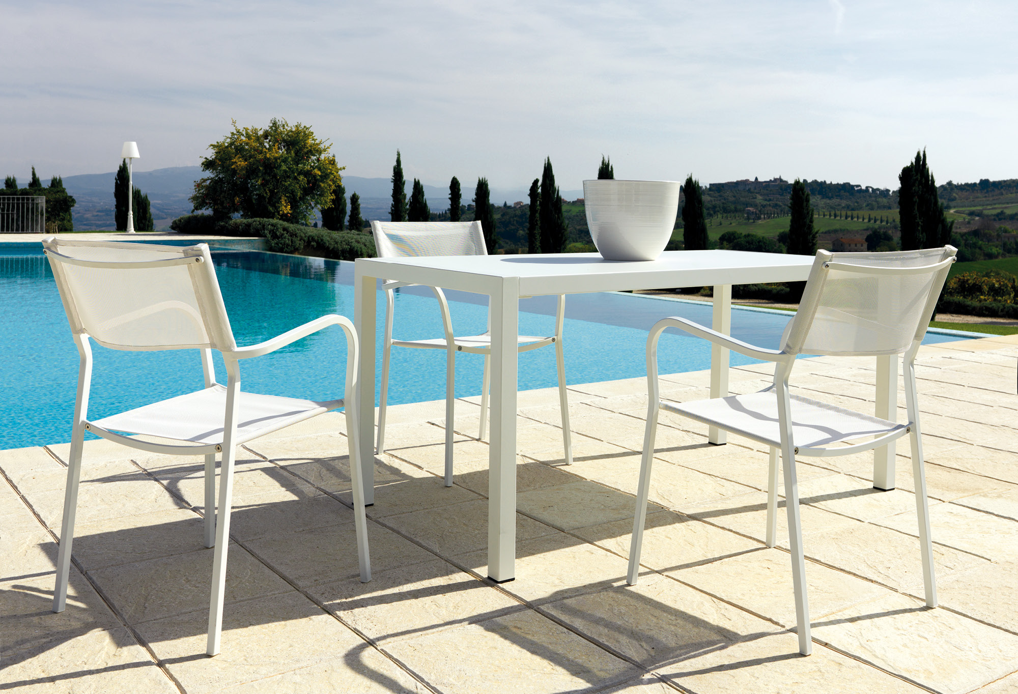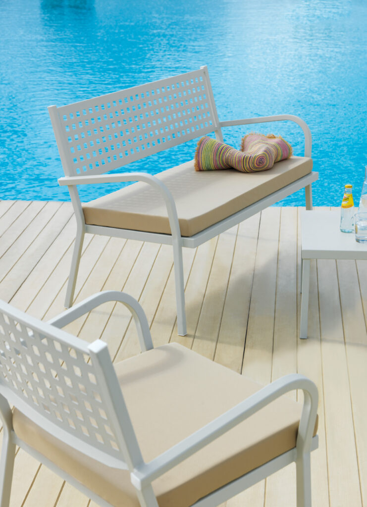 Complete with everything, chairs, table, armachairs and sofas, it is suitable for any space thanks to a sober and contemporary design. One of the new additions to the series is the extensible table with HPL top, hardwearing, convenient and functional.